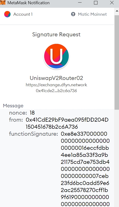 Step 5) Before signing the transaction, Dfyn will ask you to review the transaction details and confirm the transaction. Click on Confirm Swap to continue.