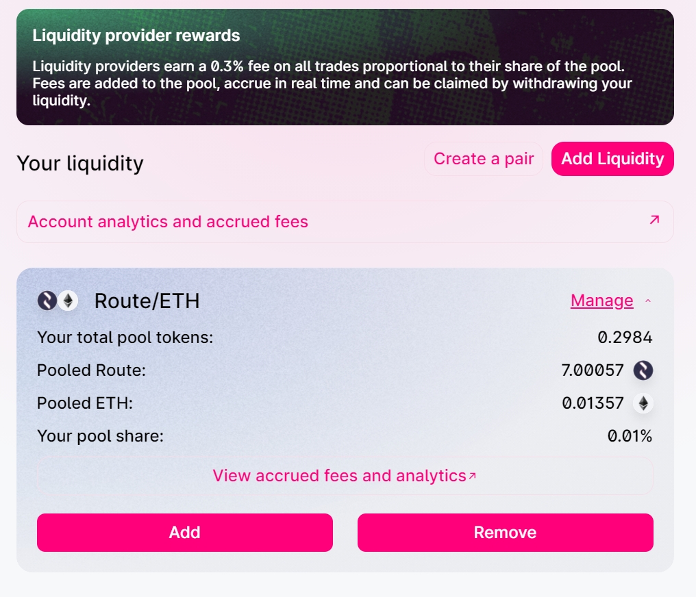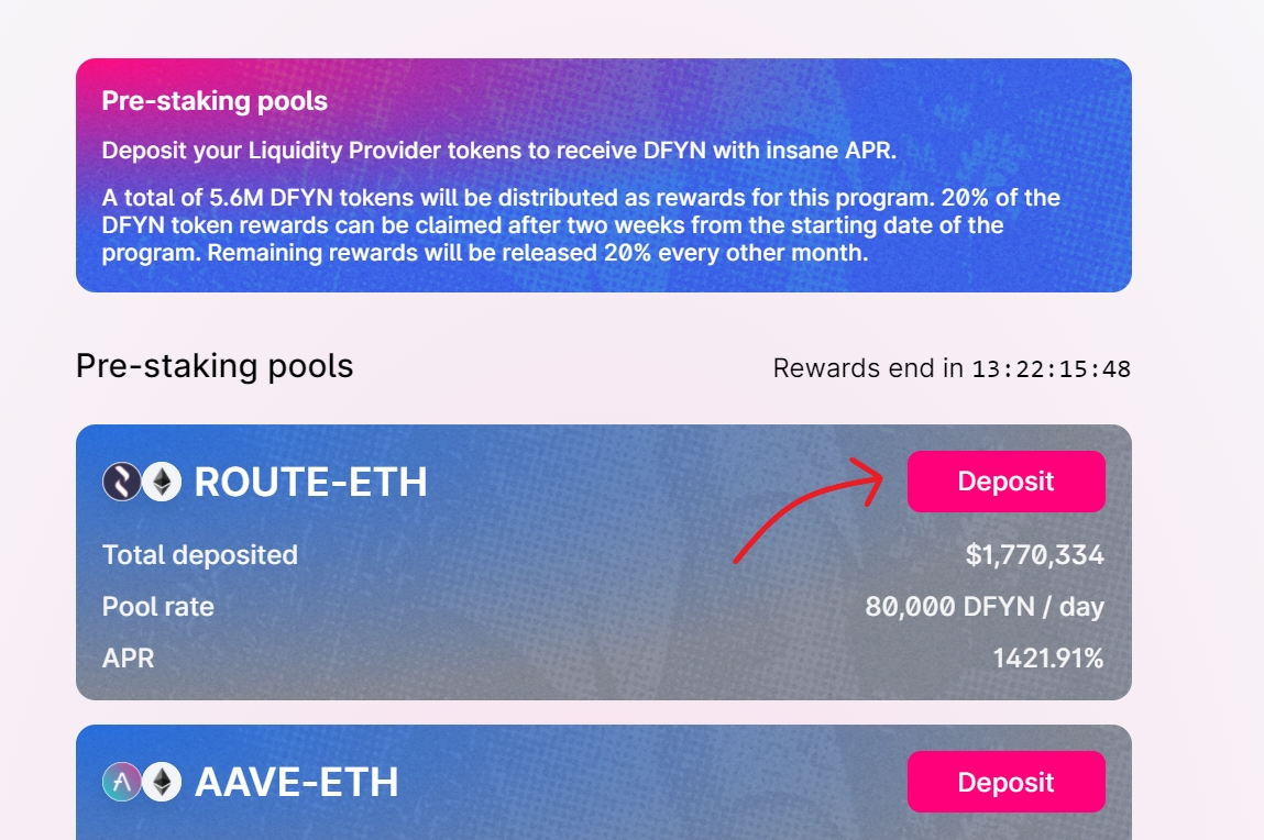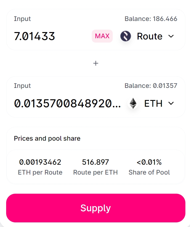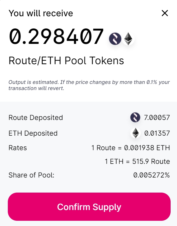 Identify the farm that you’re eligible for (I am eligible for ROUTE-ETH since I own ROUTE-ETH LP tokens) and click on Deposit. You can participate in multiple farms as long as you have LP tokens corresponding to that farm.