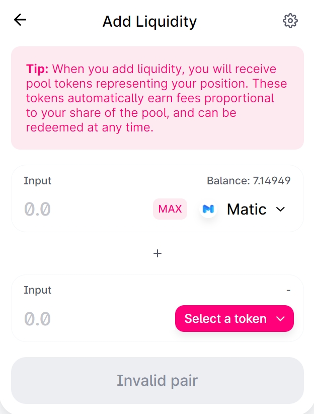 Adding liquidity to Dfyn's liquidity pools to gain LP tokens