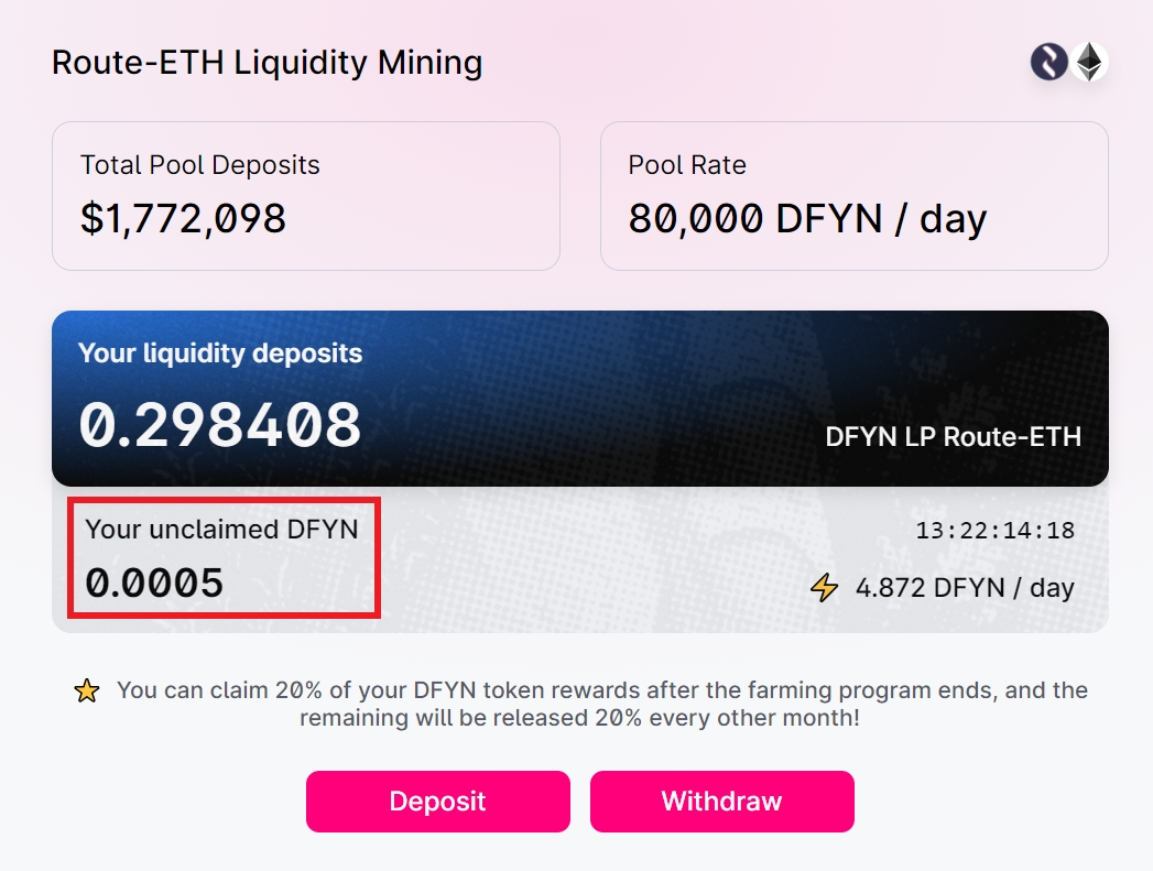 Congratulations! You have now successfully staked your LP tokens on Dfyn to earn $DFYN tokens. You can also check out the amount of $DFYN accrued under the “Your unclaimed DFYN” heading.